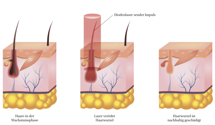Eine dauerhafte Haarentfernung funktioniert allerdings nur, wenn sich das behandelte Haar in der Wachstumsphase befindet. Da sich nie alle Haare gleichzeitig in der Wachstumsphase befinden, sind mehrere Behandlungen notwendig, um alle Haare mit dem Laser dauerhaft veröden zu können. Zwischen den Behandlungsterminen sollten also in etwa 4 bis 6 Wochen liegen.